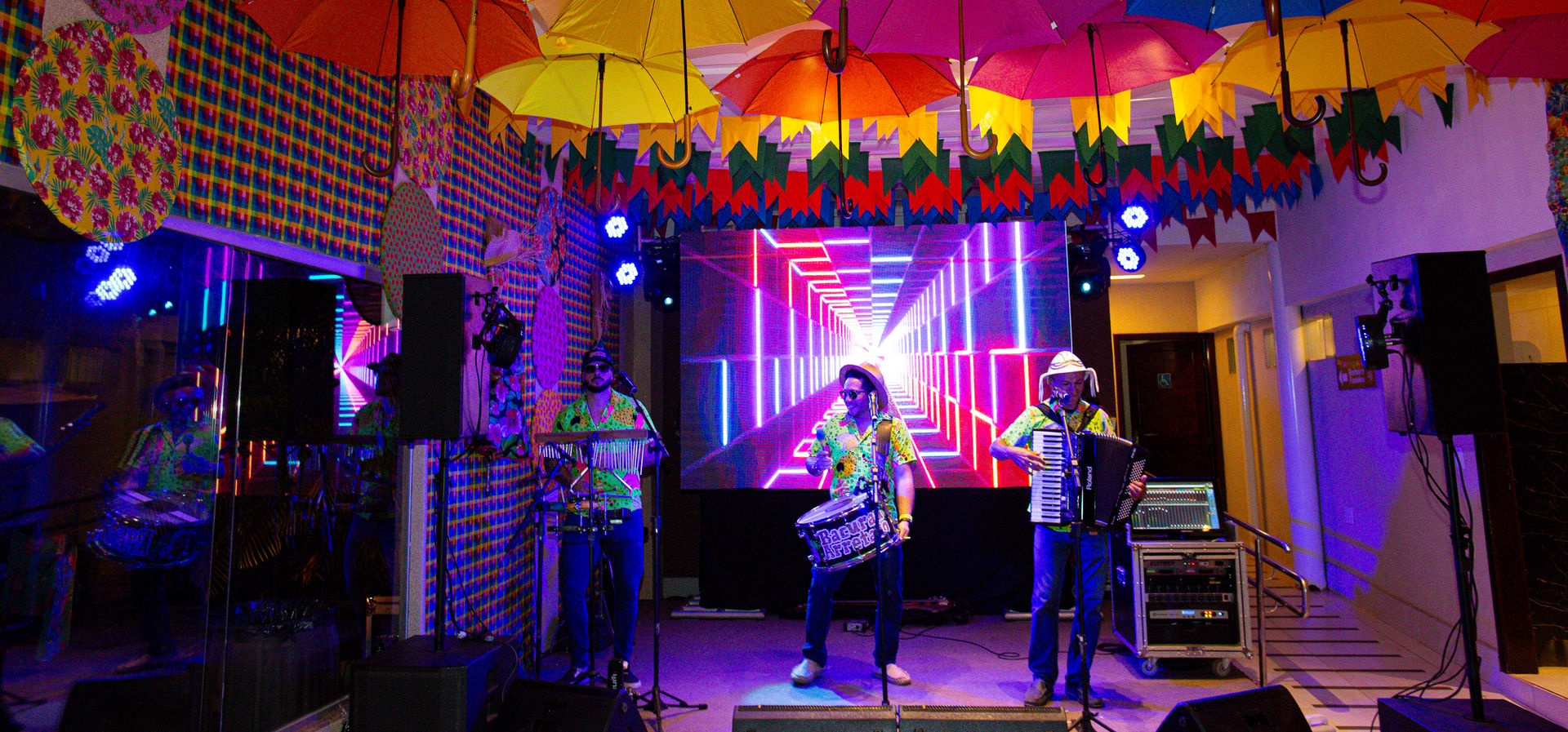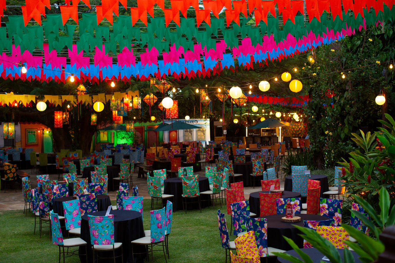Nossa ornamentação combina elementos tradicionais das festas juninas com toques de elegância e sofisticação. As mesas são decoradas com toalhas de chita e arranjos florais típicos, enquanto os espaços ao ar livre são adornados com balões e lanternas que iluminam a noite de forma mágica. Além disso, temos uma Vila Junina exclusiva, onde barracas de comidas típicas recriam a alegria das quermesses.